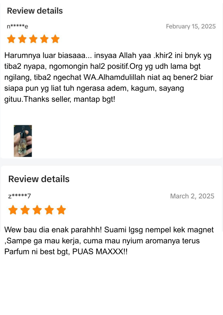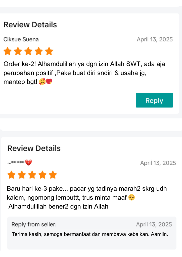 InsyaAllah minyak ini efektif atas izin Allah. Namun, efektivitasnya bisa berbeda-beda tergantung individu. Minyak ini hanyalah ikhtiar untuk membantu urusan harian kita — bagaimanapun, hanya Allah yang memberi izin dan hasilnya. Efeknya juga tergantung pada masalah yang sedang dihadapi. Ada juga yang merasakan manfaatnya seawal 1 minggu penggunaan.